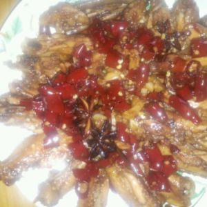 将切好的干辣椒,蒜,花椒一起放油锅炸。火不要太大!爆香后再放鸡翅一起,翻炒一下后加可乐。注意要漫过鸡翅哦!