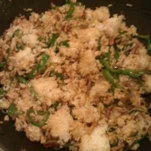 放入米饭,转小火,把米饭的小块儿弄碎,小火慢炒!