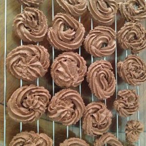 黄油加糖粉稍稍打发,蛋液分3次加入打发均匀,筛入低粉和巧克力粉,拌匀装袋挤出花纹,150度烤18分钟。