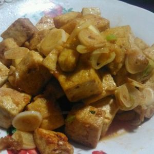 小火炸,应该可以叫煎,记得翻豆腐,尽量让豆腐每个面都煎一下。煎豆腐约10分钟后,倒入葱,姜,蒜,还可以放点老抽上色,放5滴。接着翻炒一下。