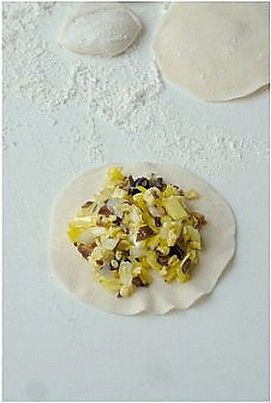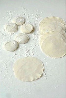 将小剂子按扁,然后以打圈的方法将其擀成中间厚边缘薄的饺子皮。