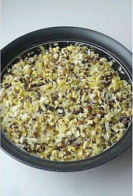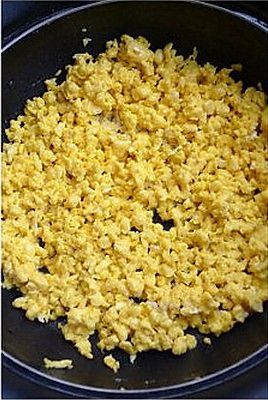 锅中加入2大勺橄榄油,将4个鸡蛋打散后倒入,用筷子划拉着炒熟,然后晾凉备用。