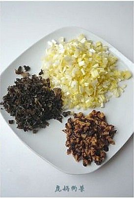 将韭黄切碎,泡发洗净后的木耳、香菇也切成细碎状。