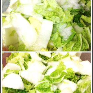 懒人开始行动啦!将切好的白菜用水洗净然后滴干水分!撒入差不多份量的盐巴!记住千万别撒太多!第一次弄就是打死卖盐的!汗!这里下图为在盐巴里腌制了两个小时候的白菜,想说的是,撒入盐巴后,要用手将盐巴与白菜混合均匀