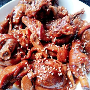锅热油,放入糖,直到变色(注意油温,不要烧过焦),放入鸭肉翻炒上色,倒入开水直至刚好没过鸭肉,放入生抽、老抽、料酒、盐,如果有烧烤酱或者耗油也可以加点