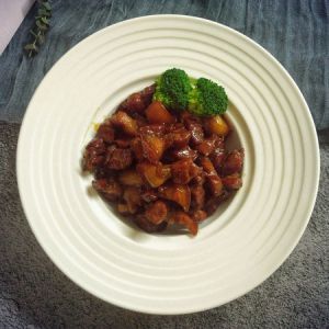 等汤汁收干肉变软烂,加几滴香油,拌匀出锅了