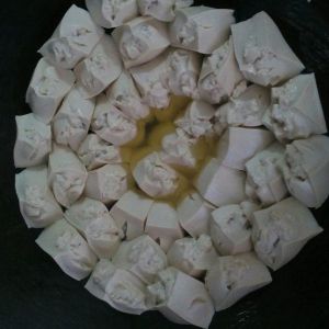 全部酿好后起火开始煮,放三碗水(水里放点盐)之后就就盖好锅,三分钟后用锅铲铲下豆腐低免得粘锅低,五分钟后再铲一次,八分钟再铲一次这时在放点酱油一起煮,十分钟可以起锅了。