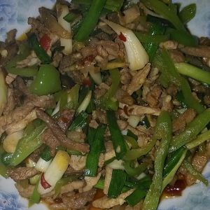 把肥肉在锅中炒出油,放入瘦肉,翻炒到肉变色,倒入青椒和蒜苗梗,炒两三分钟后加入盐、豆瓣酱和鸡精,就可以出锅了。