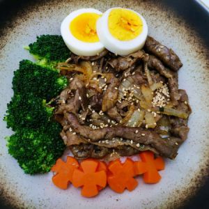 米饭铺碗底,将各种菜如图摆盘。可以切一个熟鸡蛋加上,好看又营养。最后撒上白芝麻上色加香。