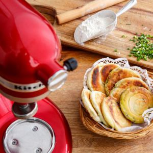 把中筋粉、糯米粉、盐和玉米油放在容器中,加入开水冲成雪花状,然后再加冷水搅拌,用KitchenAid厨师机搅拌成软面团,醒发5~10分钟。