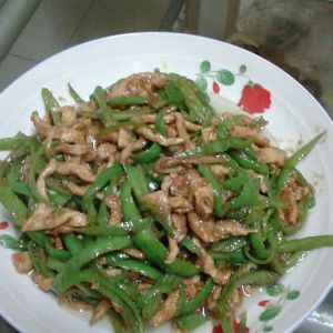 锅制好后,入油50克,倒入肉丝炒散,倒入青椒一同炒,加盐,味精起锅成菜、