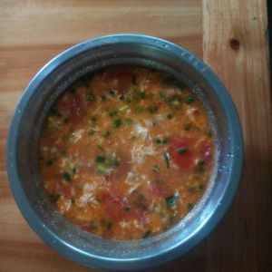 锅里放油,油冒烟后放进番茄,炒一下,然后加入一碗半水,加盐