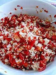 将切好的蒜末、姜、红辣椒放入一大干净无水分的容器中,加入适量盐,白酒搅拌均匀。