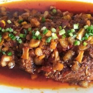 然后放入炸好的鱼大火烧开 烧开后关小火焅七八分钟 把鱼翻面儿继续焅五分钟 转成大火收汁儿 要不停晃锅以防粘锅