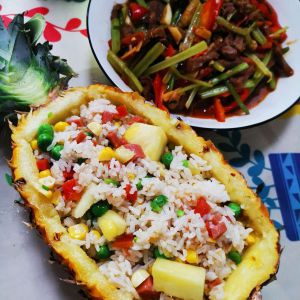 锅内倒入花生油,放入焯好水的配菜和火腿肠,加盐和耗油翻炒一分钟,加入剩米饭,米饭多炒一会,把每粒米饭都炒散,然后加入一点鸡精,倒一点点香油在饭里会更香(没有的可以忽略)最后差不多了丢入菠萝块,继续翻炒一分钟,起锅,把炒好的饭放入挖空的菠萝碗里,好吃又好看的菠萝饭就完成了~一起开吃吧!