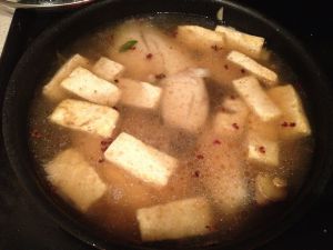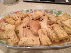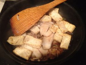 下鱼肉,豆腐。此出要慢,不要弄坏鱼肉。加料酒,生抽,陈醋炒香。