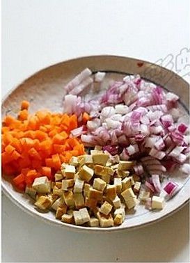 胡萝卜、洋葱、熏干分别切成小丁