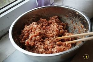 首先将肉馅搅拌好 放上必要的调味品提味。葱姜泡水后拌馅更好