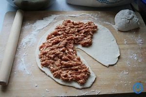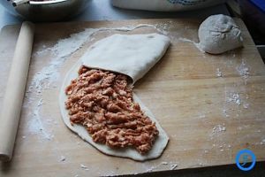 放肉馅,注意不要全部放满,之后我们还有包呢!~
