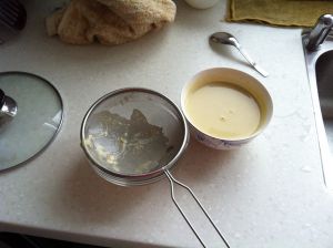 把碗里凉一些的液体过滤倒入放了蜜豆的碗里