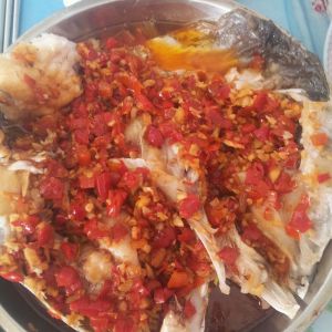 再把鱼头用盘子装着,把爆炒好的料铺在鱼头上面,然后拿到锅里蒸10分钟左右就可以了,味道超级棒的