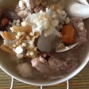 排骨飞水后放入炖盅中,将所有处理好的材料都放进去,加入姜片(也可不加)和适量的水,慢炖1.5~2小时,起锅前加入适量的盐调味即可。