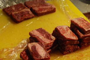 将牛肉剔除筋以及边缘风干肉质,改成15公分长,10公分宽的长方块。用盐0.1克,味0.3克,胡椒粉0.3克,生粉0.5克,拌匀腌制1小时,后加少许黑胡椒碎,放入冰箱备用。