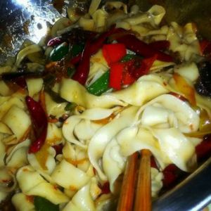 8.加入自制辣椒香油、八角、香叶、桂皮、干辣椒、花椒等,大火翻炒至出香味