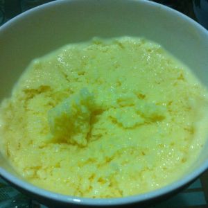 蛋液上锅,还是隔水加热,怕煮成蛋花粥所以隔水,然后把奶液加入蛋液中,加热至液体变浓稠便可以起锅了,放入事先备好的芒果泥儿。。OK放入冰箱。。期待中