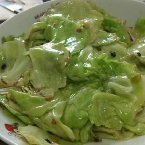加入包菜,大火快速翻炒,直至包菜叶变油亮,叶边开始变软,加一勺盐和适量味精,糖
