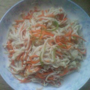 锅中倒水烧开,把金针菇,胡萝卜,辣椒倒入焯一下。(40秒左右就够了,金针菇焯的时间过长的话,容易塞牙)