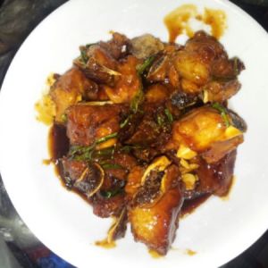 加入米醋和黄糖,米醋不用漠过排骨,中火焖至汁少一半,加适量生抽,收汁,撒上葱段,出锅