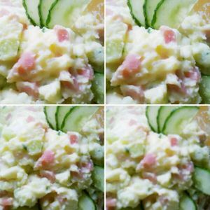 将青瓜,火腿肠,蛋白统统切成丁,放入土豆蛋黄泥中,加少量沙拉酱,搅拌均匀,简易版的土豆火腿沙拉就做好了。
