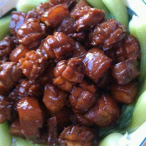 锅放油炒糖色,放入五花肉鲍鱼翻炒上色,加料酒,葱姜,花椒八角,倒入没过主料的热水大火烧开转小火加盖大约一个小时。(这时用另一个锅烧水,放少许盐把油菜焯水后码盘待用)开盖放盐收汤,放入蒜末味精装盘。