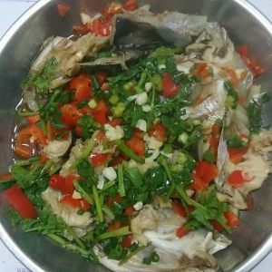 放到烧开的水的锅里中火蒸20分钟就可以了,等到差不多就加入辣椒蒸2分钟再加入葱花、香菜、撒在鱼头上面再蒸半分钟就好。