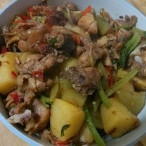 把鸡腿肉切块儿,洗去血水,用老抽,十三香,盐腌制约十分钟。