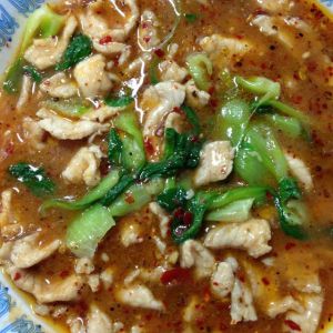 烧开水放入一大勺郫县豆瓣酱,开后将腌好的肉片放入,同时放点盐,肉片熟了以后连汤一起倒入铺菜的碗里