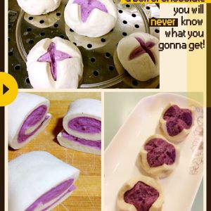 先分别用200克面粉+1克酵母做成白面团;100克面粉配上紫薯泥+1克酵母做成紫薯面团。