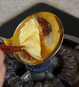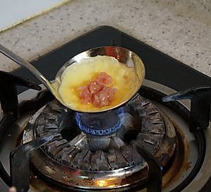 浇一勺打散的蛋液,晃动勺子,让蛋液均匀分布,如果有多余的可以倒回碗里一些;
