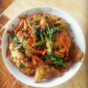 半碗醋,加3小勺糖(可根据个人口味调制),1小勺盐,鸡精,将油锅里的油倒出留少许,烧热,把之前的备好的葱姜胡萝卜丝倒入油锅炒出香味,然后将过二遍油的里脊肉和调好的汁倒入锅中,撒上香菜丝,出锅