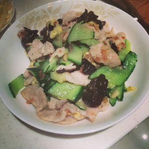 先放肉片翻炒后再按次序放入木耳,黄瓜和鸡蛋