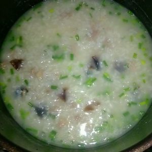放了肉的稀饭煮好了后,加入皮蛋,放鸡精,生抽,再煮十分钟