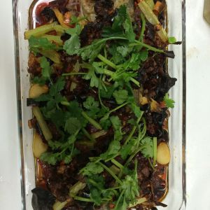 锅里留油放入葱姜蒜,在放入两大勺郫县豆瓣酱炒出红油。