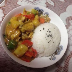 米饭盛入碗内滚圆,放上芝麻。放入咖喱鸡块。