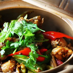 锅下油烧热,爆香田鸡。