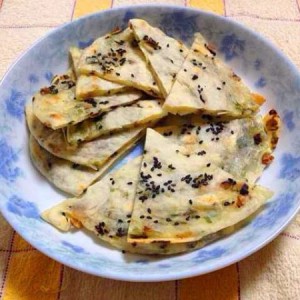 再将面饼翻面煎至金黄,取出切块装盘,即可食用。
