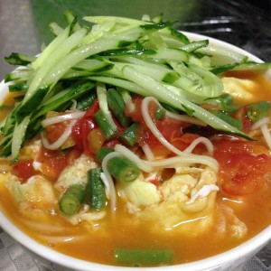 把西红柿切丁,打鸡蛋加葱花,盐少许,刮黄瓜丝,豆角丁