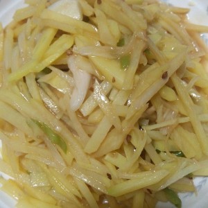 土豆切成丝。尖椒,大葱切条。大蒜拍碎。