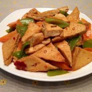 豆腐切三角块,胡萝卜及尖椒切片。葱姜蒜切碎备用。