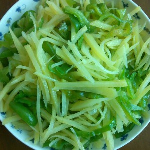 准备好的土豆青椒洗净、去皮、切丝,尽量切细一点!